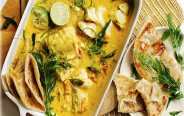 4. After 15 to 20 mins, add the rest of the coconut milk, place the fish curry in a deep plate, sprinkle chopped coriander and serve with chapatti bread.